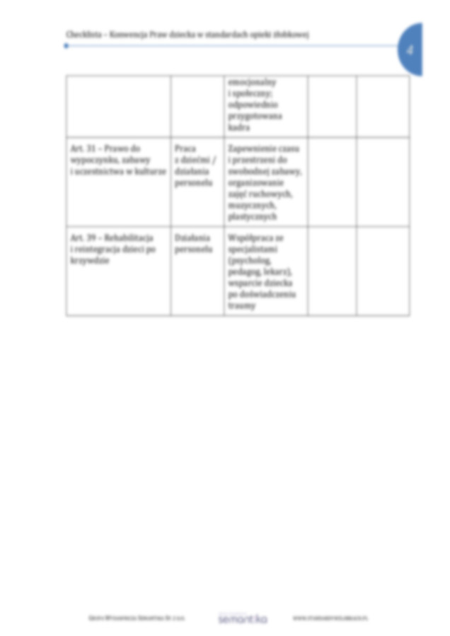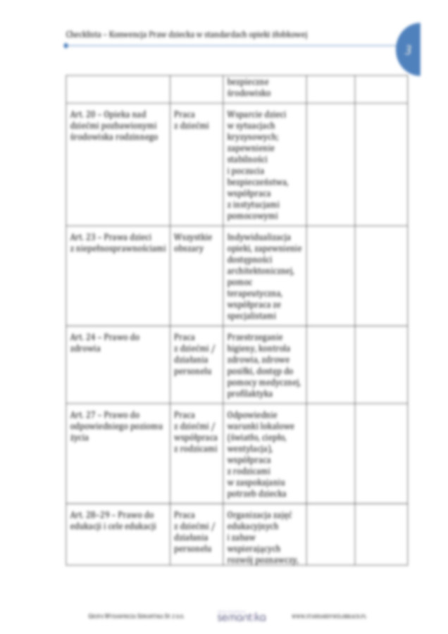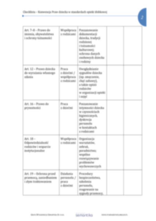 Checklista sprawdzająca realizację zapisów Konwencji o prawach dziecka w działaniach placówki żłobkowej. Wyciąg z poszczególnych artykułów Konwencji z przełożeniem na funkcjonowanie żłobka.