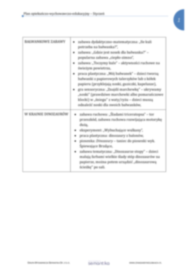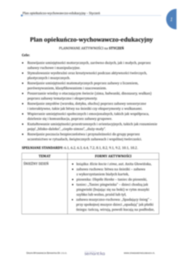 Propozycje aktywności na dany miesiąc w podziale tematycznym oraz rozbudowanej formie, wskazując cele, formy dydaktyczne i metodykę pracy.