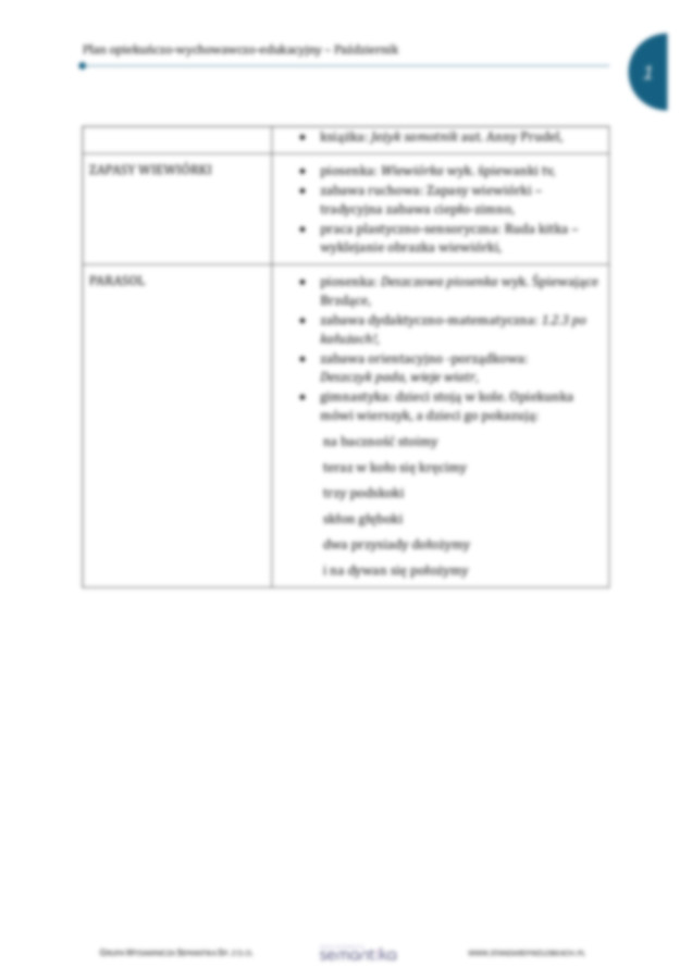 Propozycje aktywności na dany miesiąc w podziale tematycznym oraz rozbudowanej formie, wskazując cele, formy dydaktyczne i metodykę pracy.