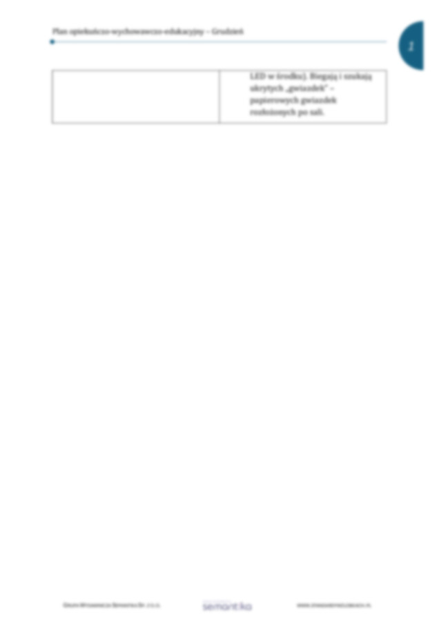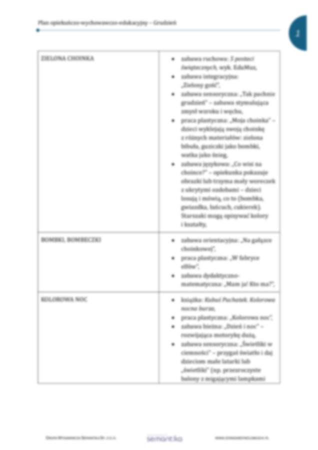 Propozycje aktywności na dany miesiąc w podziale tematycznym oraz rozbudowanej formie, wskazując cele, formy dydaktyczne i metodykę pracy.