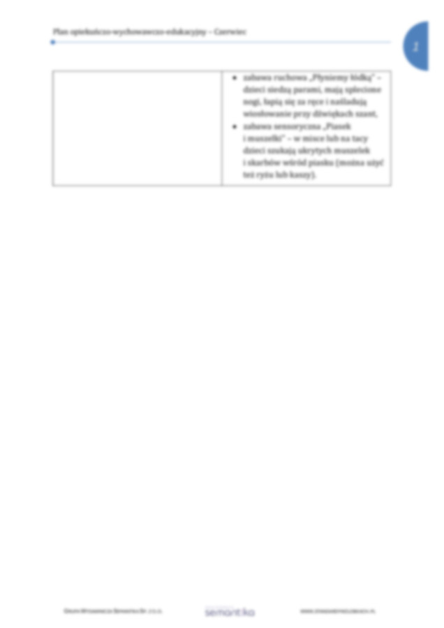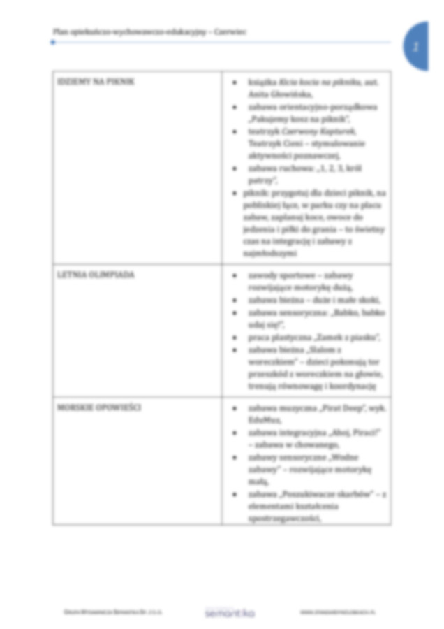 Propozycje aktywności na dany miesiąc w podziale tematycznym oraz rozbudowanej formie, wskazując cele, formy dydaktyczne i metodykę pracy.