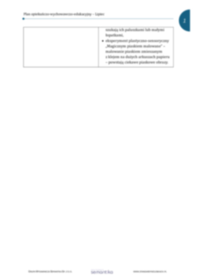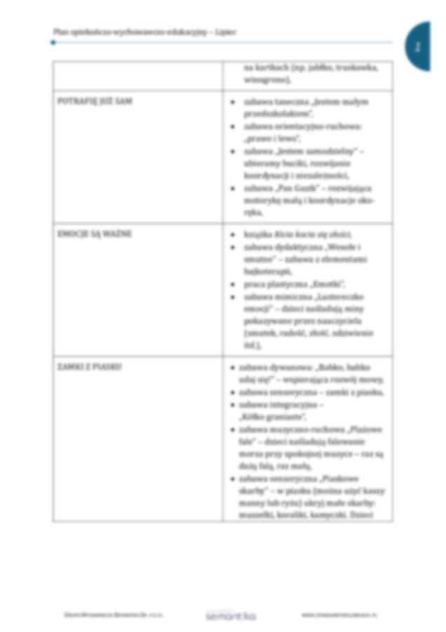 Propozycje aktywności na dany miesiąc w podziale tematycznym oraz rozbudowanej formie, wskazując cele, formy dydaktyczne i metodykę pracy.