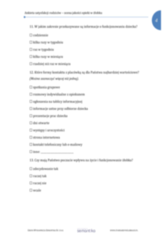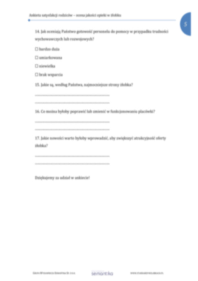 Strona główna / Dokumenty / Obszar współpracy z rodzicami / Standard 16.5 Ankieta satysfakcji rodziców ocena jakości opieki w żłobku