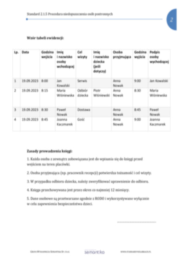 Standard 2.1 Określone są procedury przebywania osób dorosłych innych niż personel i rodzice na terenie instytucji opieki.